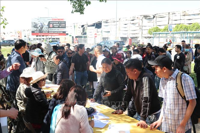 Các chủ quầy hàng bị thiệt hại trong vụ cháy TTTM Marywilska tập trung làm thủ tục nhận tiền hỗ trợ. Ảnh: TTXVN |