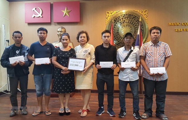 Đại diện Tổng hội người Việt tại Thái Lan trao quà động viên gia đình các nạn nhân - Ảnh: Sơn Nam/TTXVN |