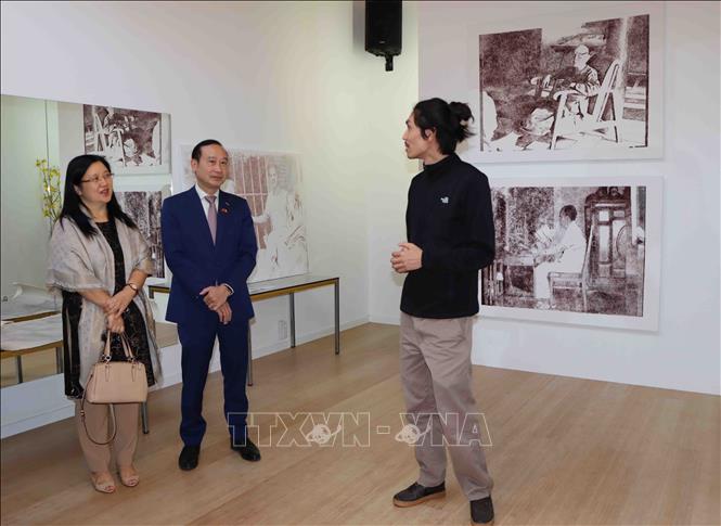 Họa sĩ Thi Nguyễn giới thiệu tranh với Đại sứ Việt Nam tại Vương quốc Bỉ Nguyễn Văn Thảo và phu nhân. Ảnh: Hương Giang/TTXVN |