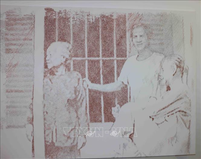 Cảnh sinh hoạt thường ngày trong gia đình của ông bà họa sĩ Thi Nguyễn tại Việt Nam được vẽ bằng thuật toán trên máy tính và in trên giấy dó. Ảnh: Hương Giang/TTXVN |