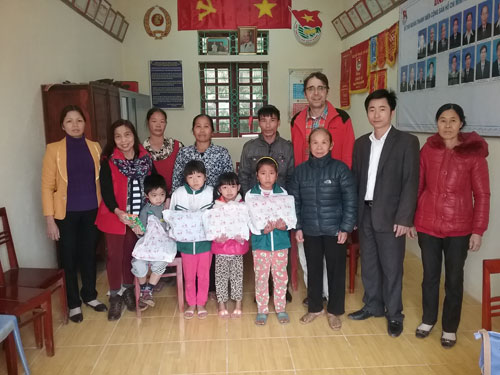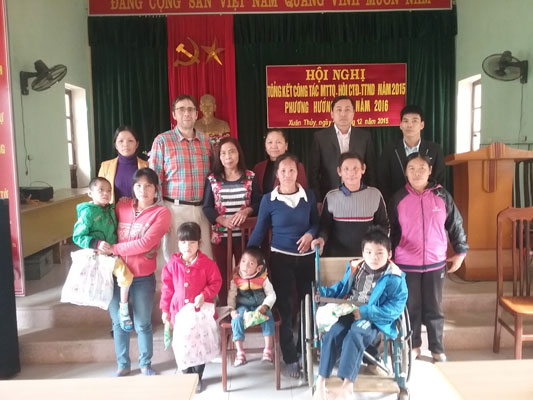 | Họa sĩ Đoàn Thanh và ông Erich Rettensteiner đại điện cho Hội Măng Non tặng quà trẻ em khuyết tật, nạn nhân chất độc da cam/dioxin huyện Yên Lập |