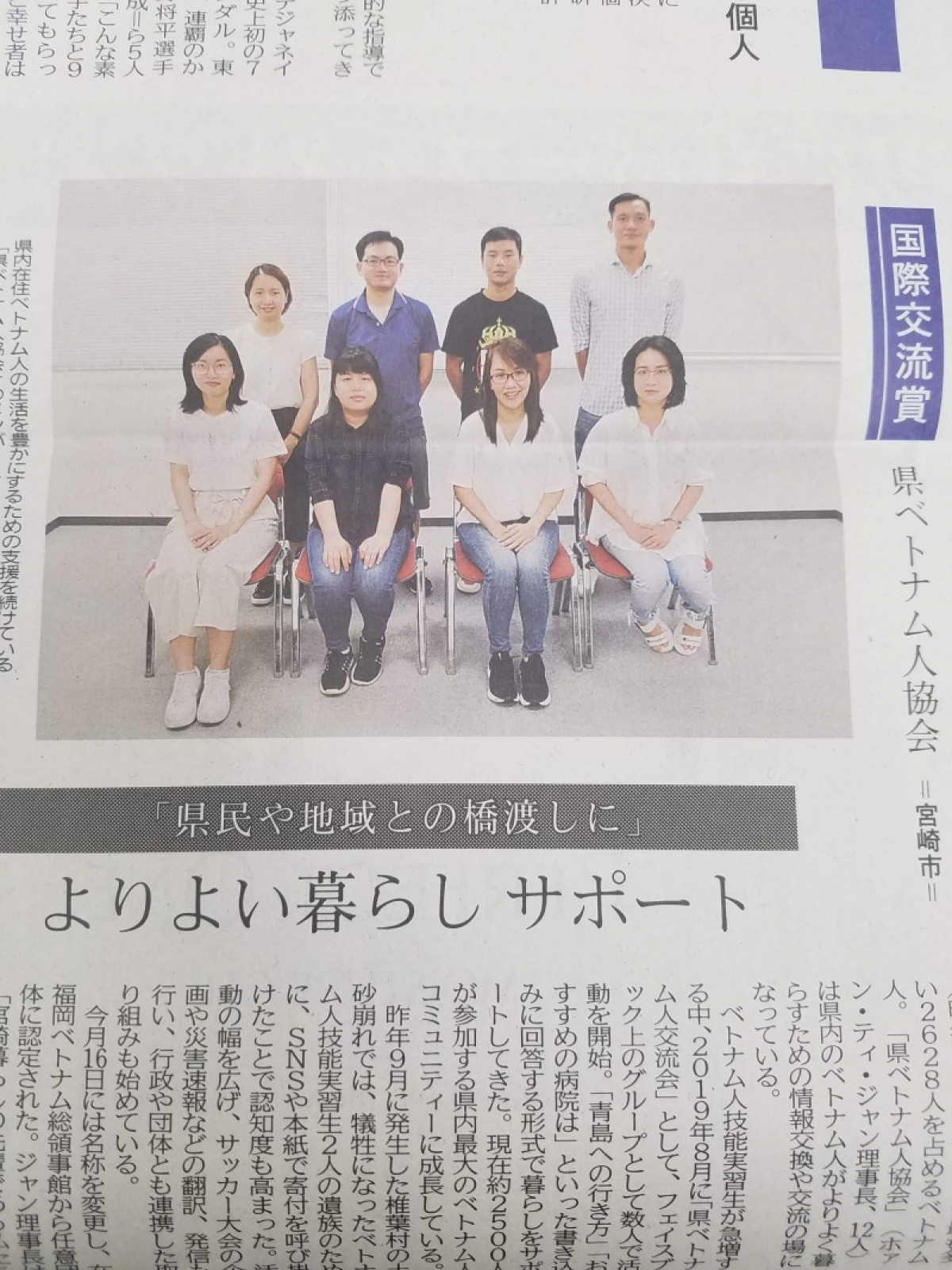 Hội người Việt Nam tại Miyazaki đã được báo Miyanichi (Miyazakinichinichi) trao giải thưởng “Giao lưu quốc tế”. Chị Hoàng Thị Giang, Chủ tịch Hội đã thay mặt Hội nhận giải thưởng danh giá này. Giải thưởng bao gồm Bằng khen, Giấy chứng nhận và khoản tiền trị giá 100.000 Yên (khoảng 20 triệu VNĐ).