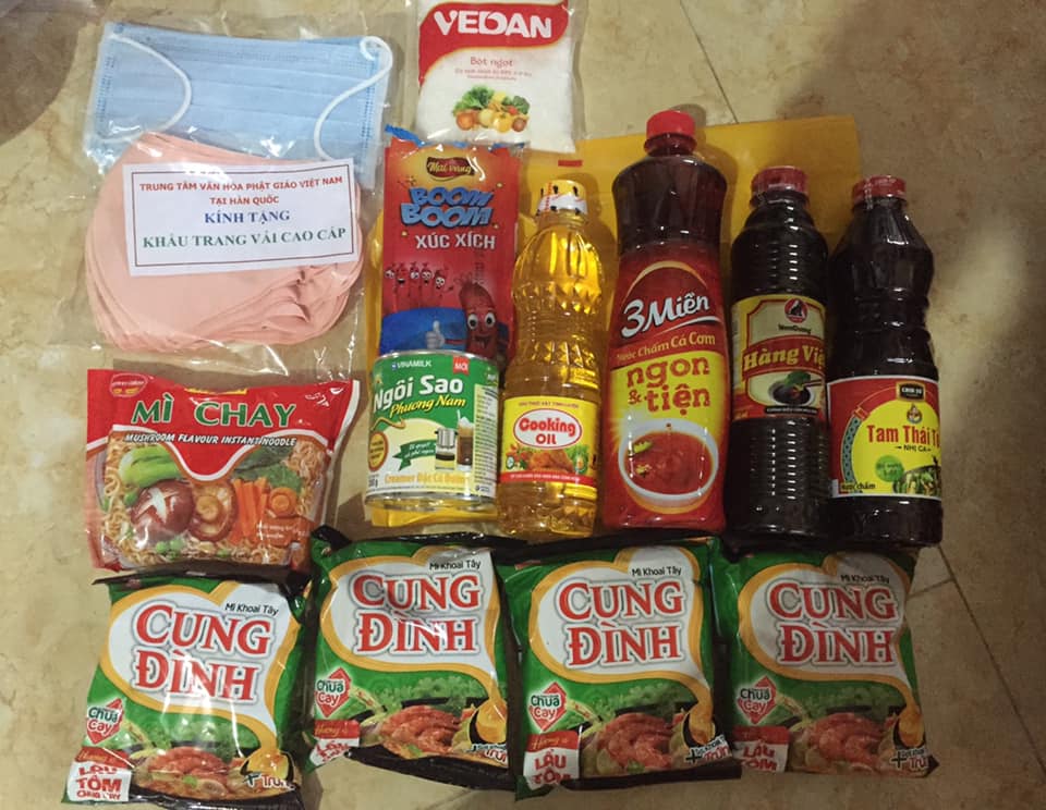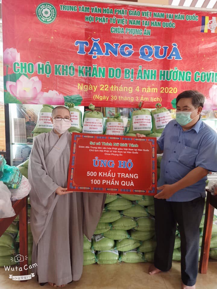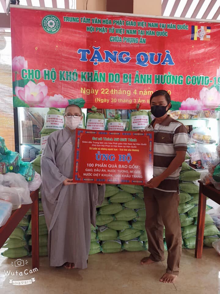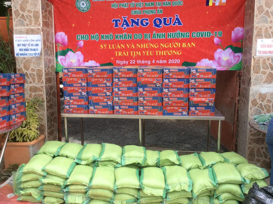 Ngày 22/4, Trung tâm Văn hóa Phật giáo Việt Nam tại Hàn Quốc, Hội Phật tử Việt Nam tại Hàn Quốc và Chùa Phụng Ân cùng các nhà hảo tâm tặng 200 phần quà tình nghĩa tới bà con có hoàn cảnh khó khăn tại xã Tân Thạnh Đông, huyện Củ Chi, Thành phố Hồ Chí Minh. Mỗi phần quà gồm gạo, mì gói, nước tương, dầu ăn, khẩu trang, cồn sát khuẩn. Tổng trị giá quà tặng hơn 65 triệu đồng.