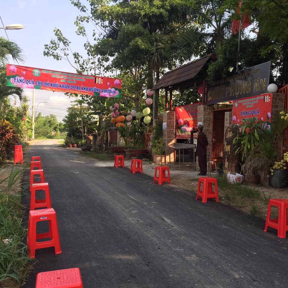 Do dịch bệnh nên quà được xếp sẵn ở cổng chùa, ghế được đặt dãn cách đúng theo quy định để bà con ngồi khi đến nhận quà.