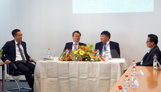 Đại sứ Việt Nam tại CHLB Đức Đoàn Xuân Hưng (thứ hai từ phải sang) trao đổi cùng các thanh niên, sinh viên Việt Nam tại buổi tọa đàm (Ảnh: Anh Đức/TTXVN) |