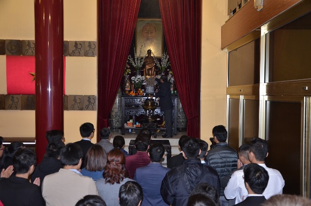 | Các đại biểu có mặt đã dự lễ dâng hương Chủ tịch Hồ Chí Minh tại bàn thờ của Người đặt tại trụ sở Đại sứ quán Việt Nam tại Pháp. ẢNh theo:baotintuc.vn |