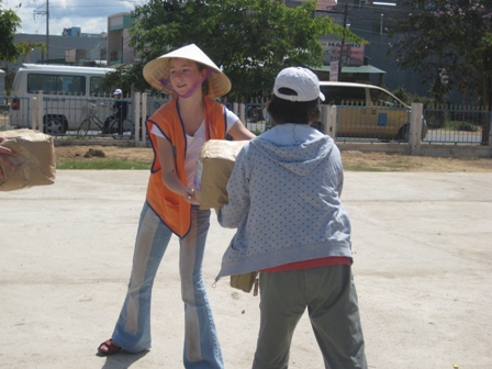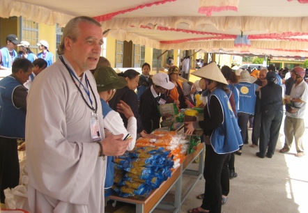 | Hein -Jorg Dinninger người Đức đứng phát quà tặng cho đồng bào nghèo |