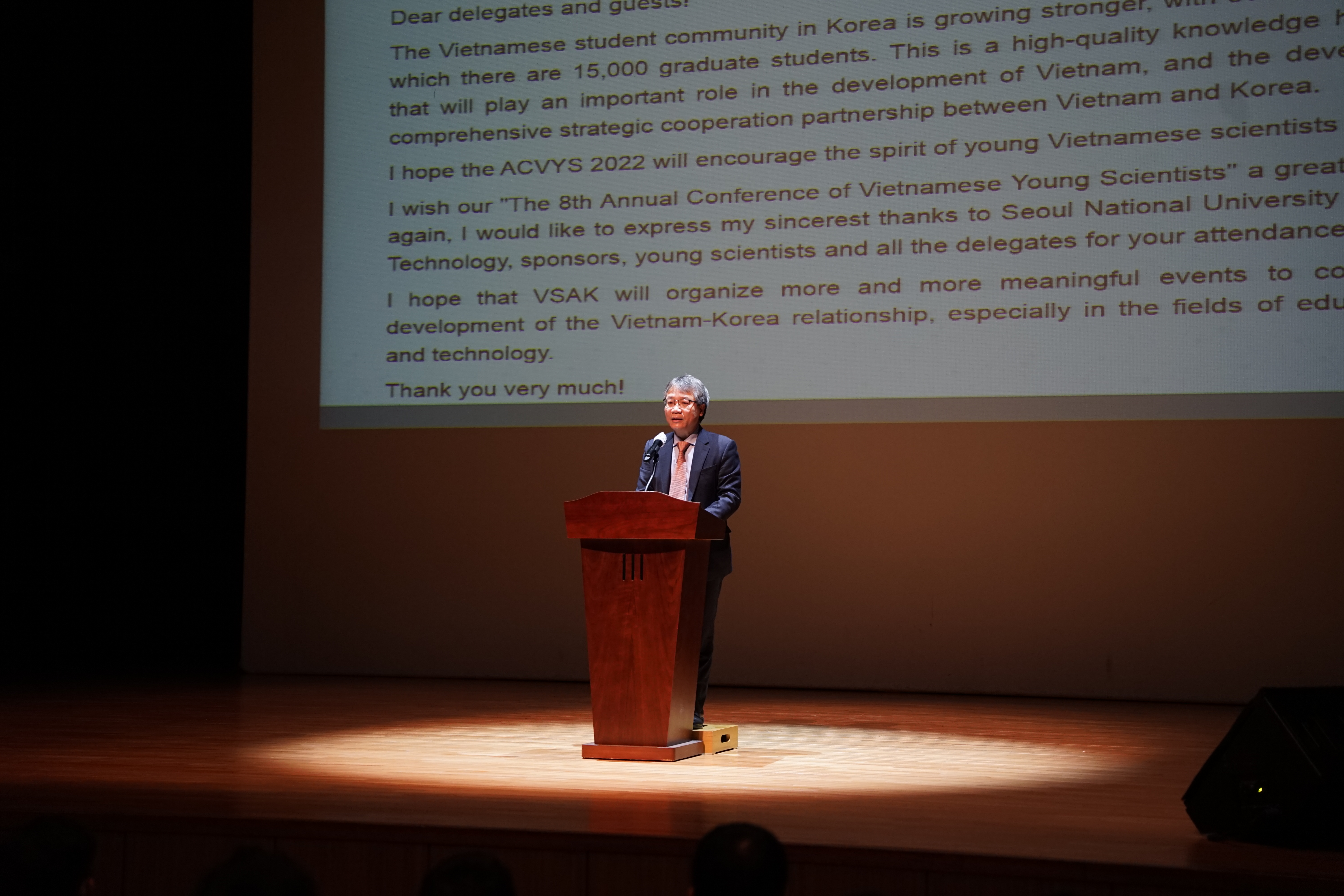 Đánh giá cao sự cố gắng trong quá trình tổ chức sự kiện của VSAK, Đại sứ đặc mệnh toàn quyền nước CHXHCN Việt Nam tại Hàn Quốc - GS.TS Nguyễn Vũ Tùng nhấn mạnh, cộng đồng du học sinh Việt Nam tại Hàn Quốc ngày càng lớn mạnh, đây là nguồn nhân lực tri thức chất lượng cao góp phần quan trọng trong sự phát triển của Việt Nam và mối quan hệ ngoại giao Việt Nam – Hàn Quốc. Đại sứ hy vọng trong tương lai sẽ càng có nhiều sự kiện giao lưu để thắt chặt mối quan hệ hai nước, đặc biệt trong lĩnh vực phát triển giáo dục, khoa học và kỹ thuật.