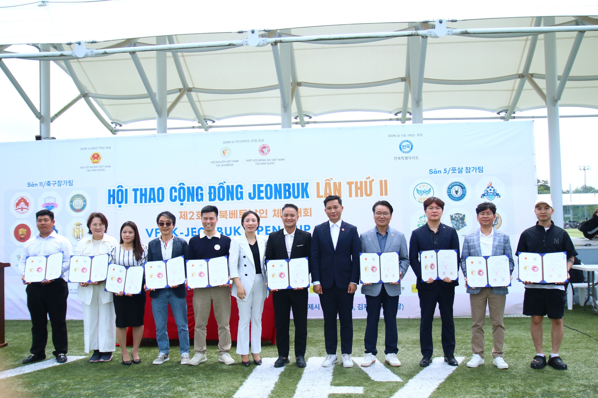 Bà Ứng Diệu Linh, Chủ tịch Hội người Việt Nam tại Jeonbuk, và ông Đoàn Quang Việt, Chủ tịch Hiệp hội bóng đá Việt Nam tại Hàn Quốc, trao chứng nhận cho các nhà tài trợ của Hội thao. |