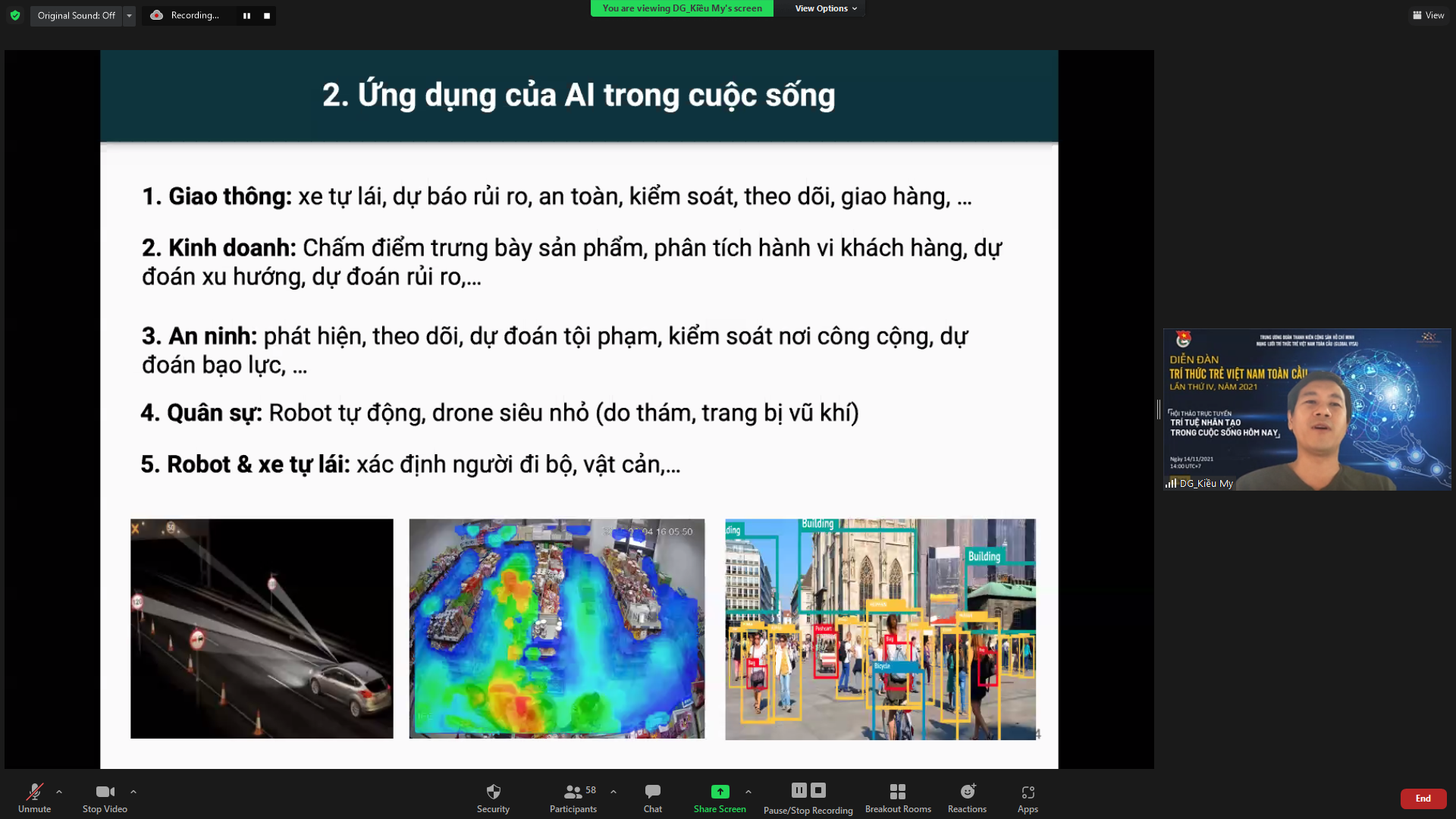 Với chủ đề “Các ứng dụng trí tuệ nhân tạo trong số hoá”, Tiến sĩ Kiều My đưa ra cái nhìn tổng quan về trí tuệ nhân tạo, đi kèm với những ứng dụng thực tiễn như nhận diện giọng nói và camera phỏng đoán hướng đi. Là một chuyên gia về ngành công nghệ thông tin, ông đã đưa ra những lời khuyên, định hướng tự học cho các bạn trẻ đang có ý định theo đuổi lĩnh vực trí tuệ nhân tạo, vốn được coi là xu hướng mới trong bối cảnh hiện nay.
