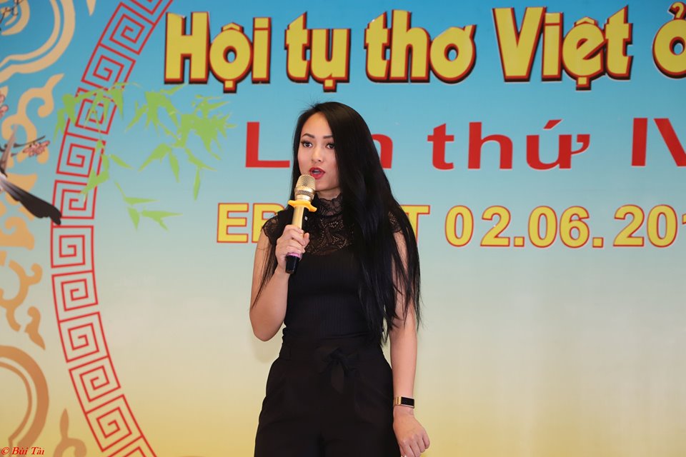Bạn trẻ Vũ thị Giao Linh, là thế hệ người Việt thứ 2 tại CHLB Đức, đọc thơ của mình tại buổi gặp gỡ. Giao Linh bày tỏ, làm thơ trở thành một niềm vui và cũng để tìm hiểu, học hỏi ngôn ngữ và văn hóa Việt Nam. - Ảnh: Bùi Tài