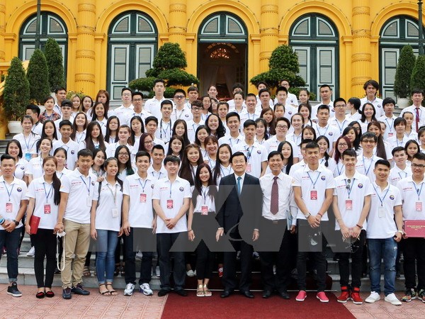 Chủ tịch nước Trương Tấn Sang với đại biểu thanh niên, sinh viên kiều bào tiêu biểu. (Ảnh: Nguyễn Khang/TTXVN)