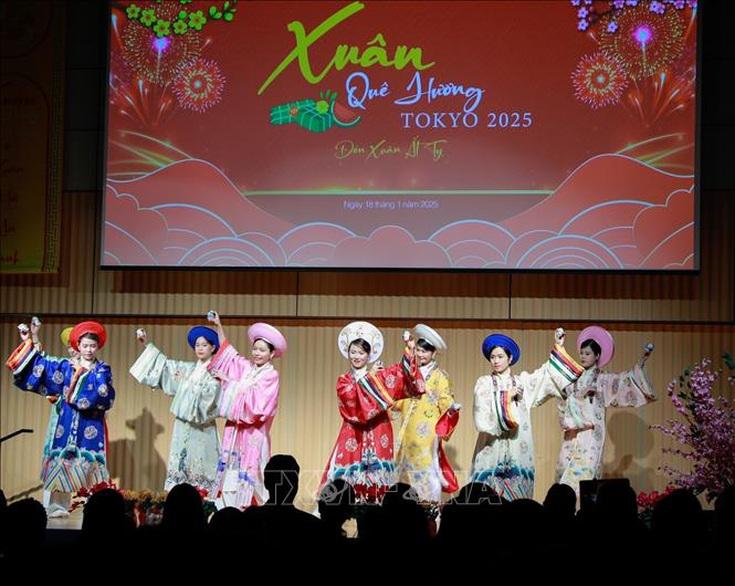 Màn trình diễn trang phục áo dài của các hội đoàn trong cộng đồng người Việt tại Nhật Bản trong chương trình Xuân quê hương Tokyo 2025. Ảnh: TTXVN |