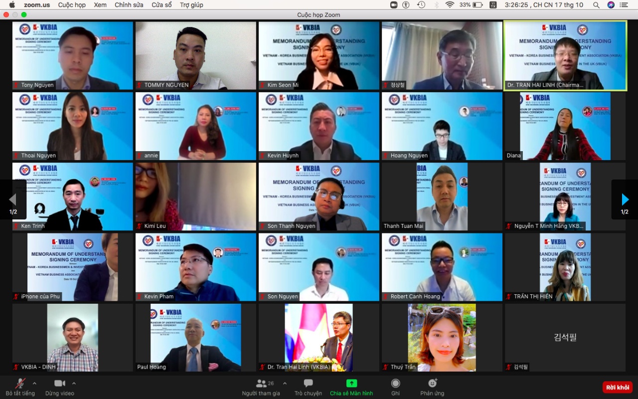 Hiệp hội Doanh nhân & Đầu tư Việt Nam – Hàn Quốc (VKBIA) và Hội Doanh nghiệp Việt Nam tại Vương quốc Anh (VBUK) ngày 18/10 ký kết bản ghi nhớ hợp tác toàn diện theo hình thức trực tuyến cho chương trình “Phối hợp quảng bá, thu hút đầu tư, hợp tác kinh doanh, hỗ trợ tiêu thụ hàng Việt Nam ở nước ngoài”.