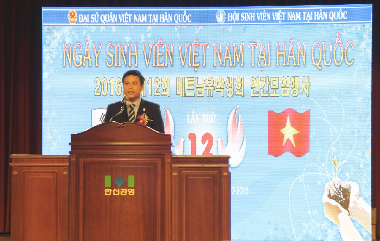 | Anh Phạm Hải Chiến, Chủ tịch Hội sinh viên Việt Nam tại Hàn Quốc khóa V, phát biểu trong lễ khai mạc ngày sinh viên Việt Nam tại Hàn Quốc diễn ra vào tháng 10 năm 2016. |