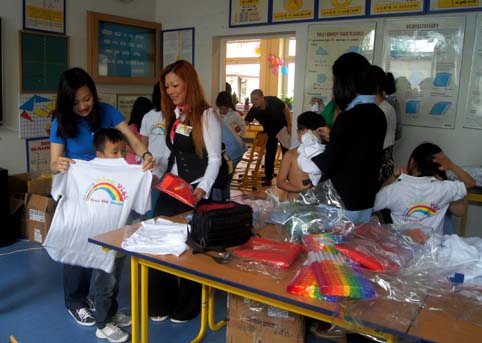 Các trại viên (áo trắng), tình nguyện viên (áo xanh) và giáo viên (áo đỏ).