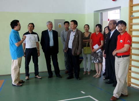 Thành viên Ban tổ chức giới thiệu với các vị khách cơ sở vật chất của trại hè_Trong ảnh: Phòng thể dục, thể thao.