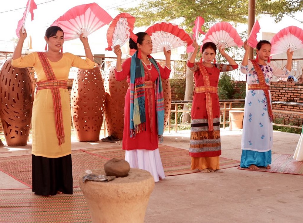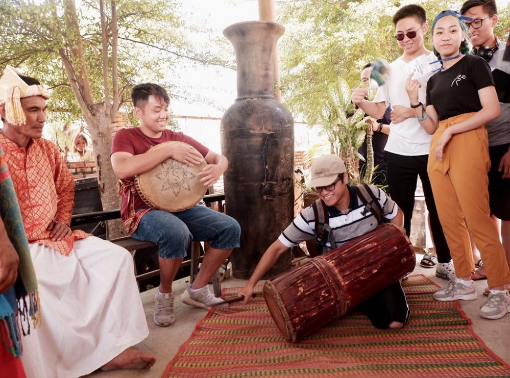 Các bạn trẻ kiều bào chiêm ngưỡng nhiều sản phẩm gốm Chăm đa dạng về chủng loại, xem biểu diễn văn nghệ với các nhạc cụ truyền thống của người Chăm và đặc biệt là xem các nghệ nhân chế tác gốm.