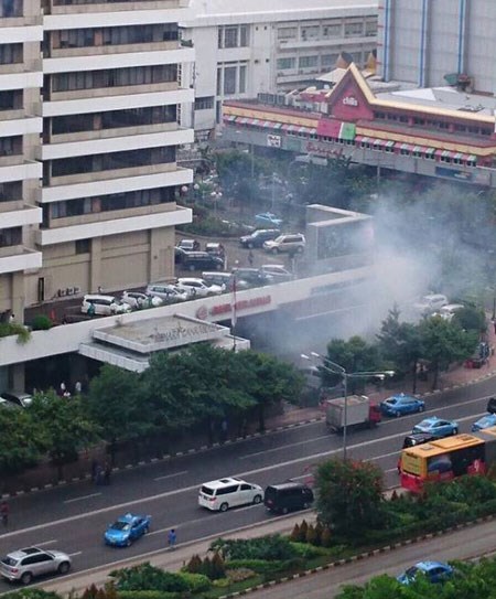 Trước đó, trưa nay (giờ địa phương), tại thủ đô Jakarta, Indonesia, xảy ra các vụ đánh bom liên hoàn và nổ súng tại trung tâm thương mại Sarinah và một đồn cảnh sát gần đó. Theo người phát ngôn cảnh sát Jakarta Muhammad Iqbal, vụ đánh bom liên hoàn và đấu súng đã kết thúc. Ít nhất 7 người đã thiệt mạng, gồm 2 dân thường, trong đó có một công dân người Hà Lan, và 5 đối tượng tấn công, trong đó có 2 phần tử đánh bom liều chết. Ngoài ra có 20 người bị thương. Cảnh sát Jakarta khẳng định không còn đối tượng tấn công nào xung quanh trung tâm thương mại Sarinah và lực lượng an ninh đã kiểm soát tình hình. Ngoài ra, cảnh sát đã bắt giữ 4 đối tượng tình nghi dính líu đến vụ tấn công trên.