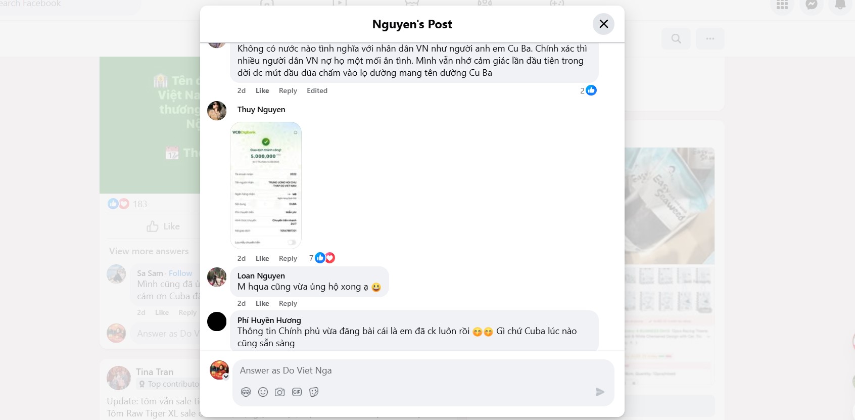 Có những thành viên chia sẻ nguyện vọng rất muốn ủng hộ Cuba nhưng không có tài khoản tiền Việt thế là ngay lập tức có thành viên hướng dẫn cách đến các đại lý chuyển tiền để có thể gửi tiền vào tài khoản của Hội Chữ Thập đỏ Việt Nam.