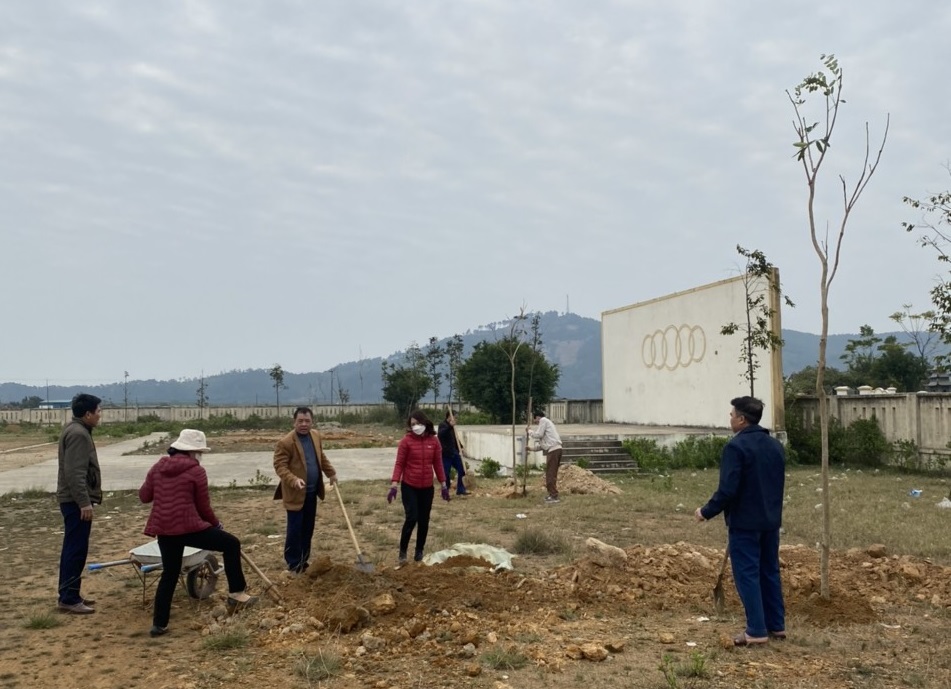 Các cán bộ và thầy cô giáo xã Hải Lộc tham gia trồng cây tại nhà văn hóa xã và trường học. |