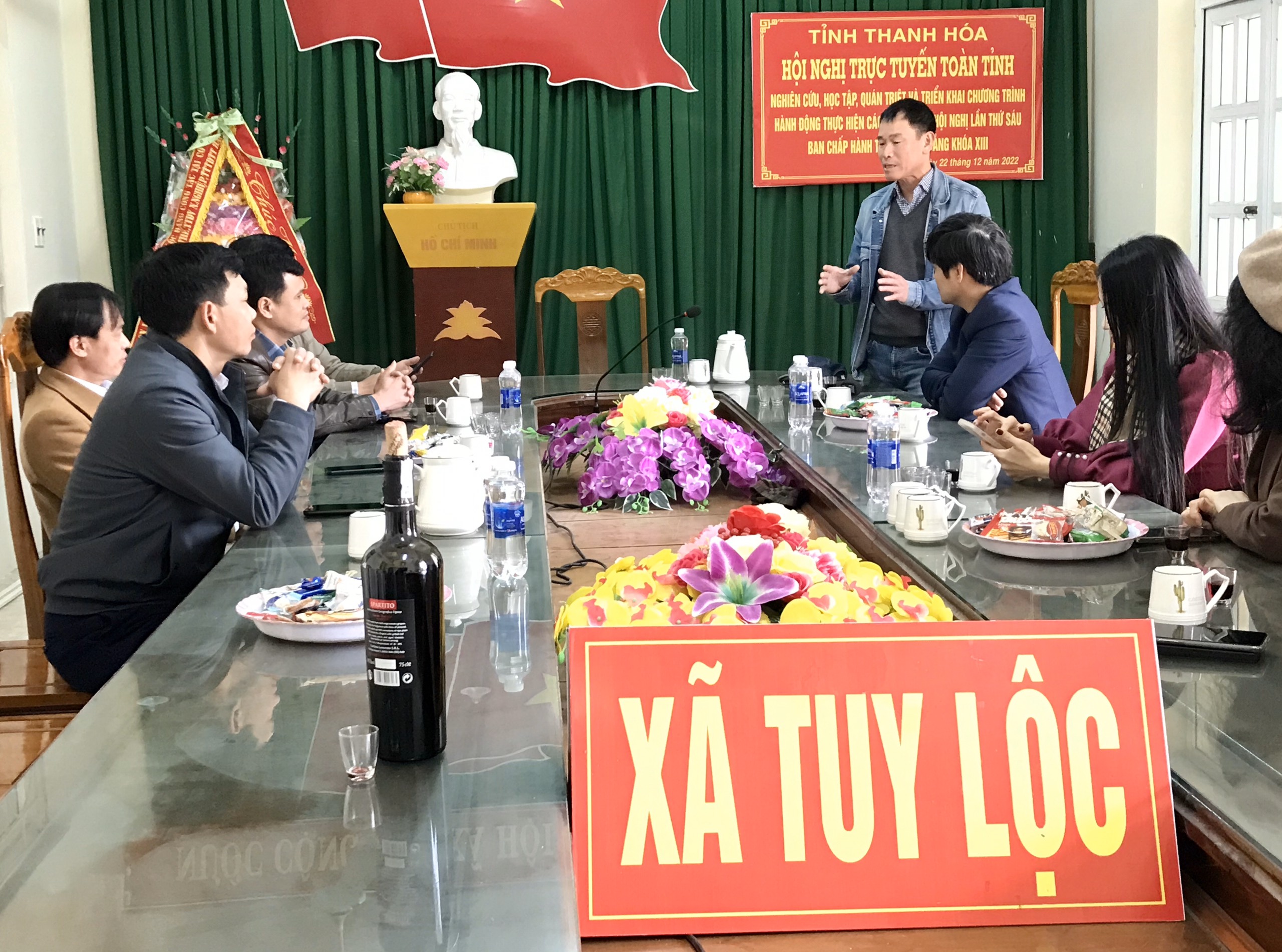 Ông Phạm Hùng Mạnh chia sẻ với lãnh đạo xã Tuy Lộc về tình yêu của mình với cây xanh. |