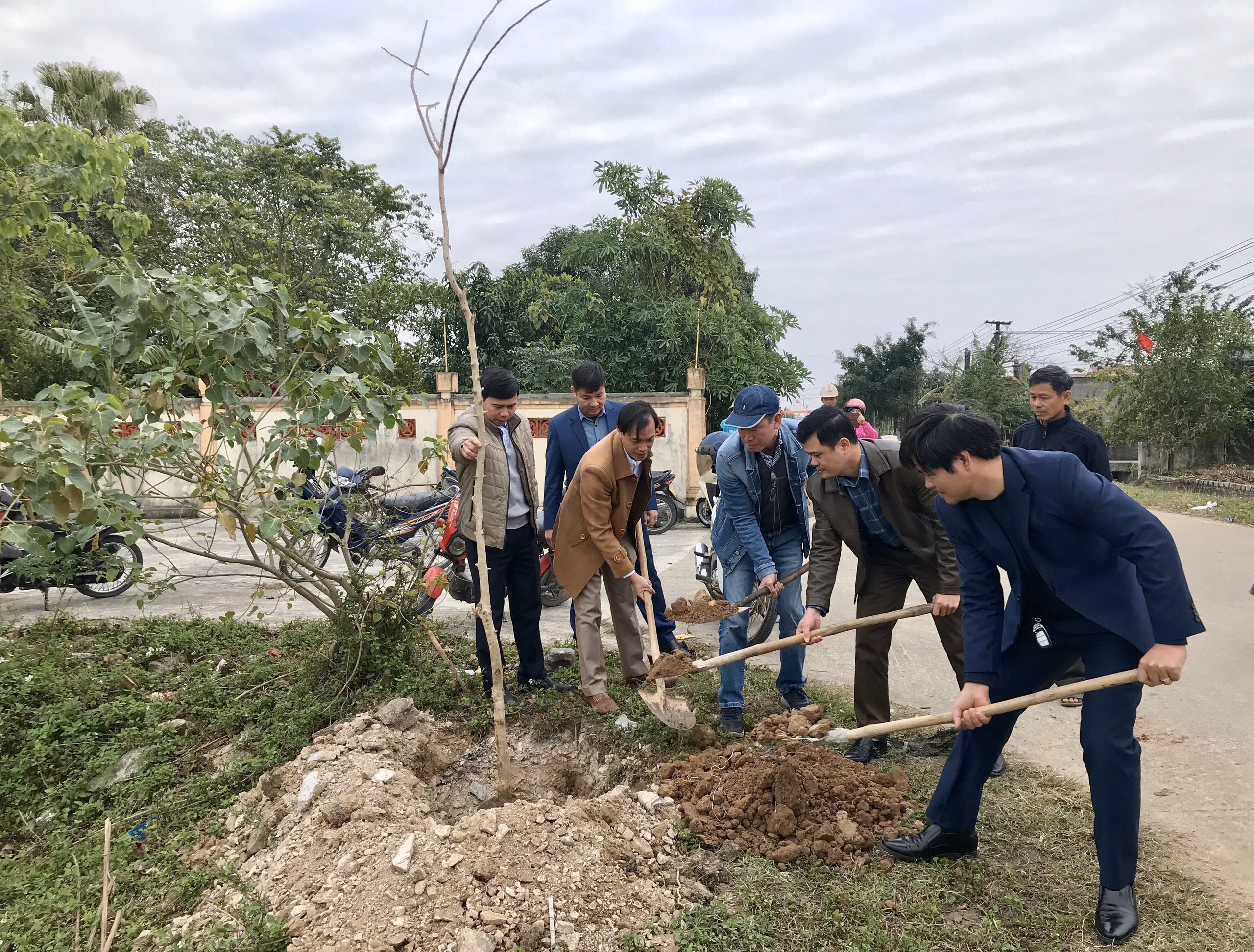 Ông Phạm Hùng Mạnh và lãnh đạo xã Tuy Lộc, huyện Hậu Lộc, trồng cây tại khu vực cạnh chùa Ngọc Đới, di tích quốc gia. |
