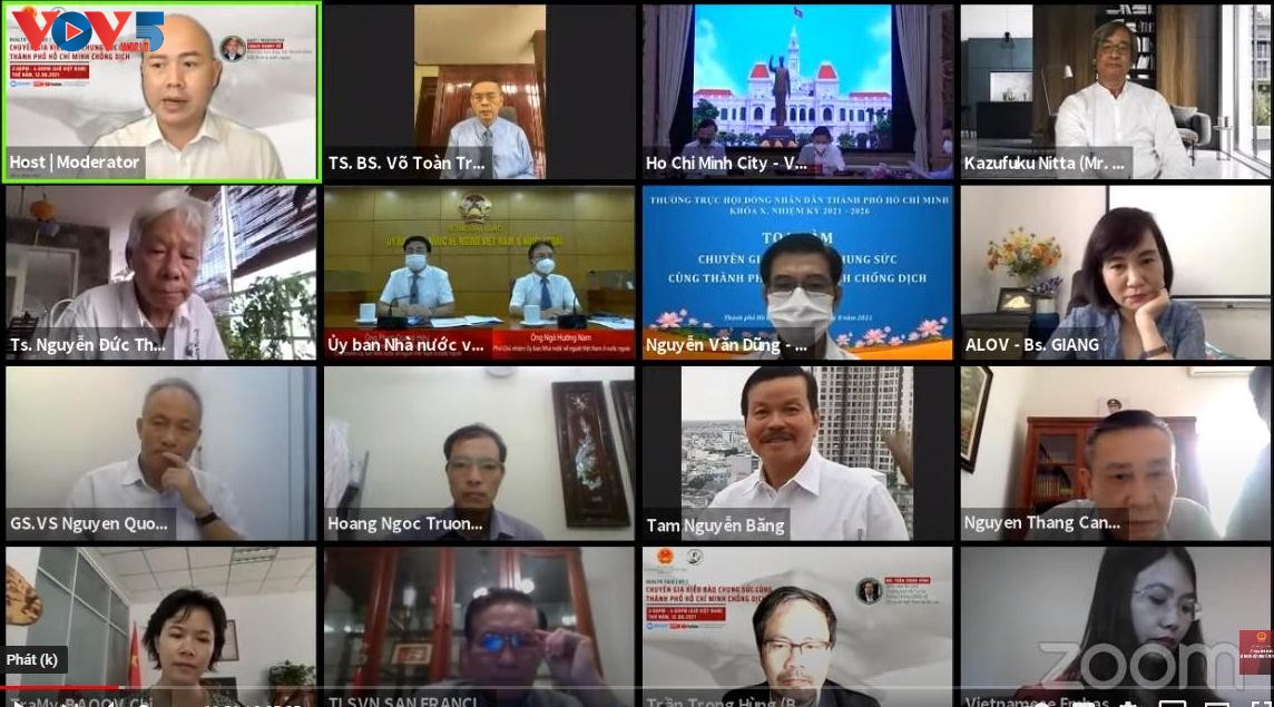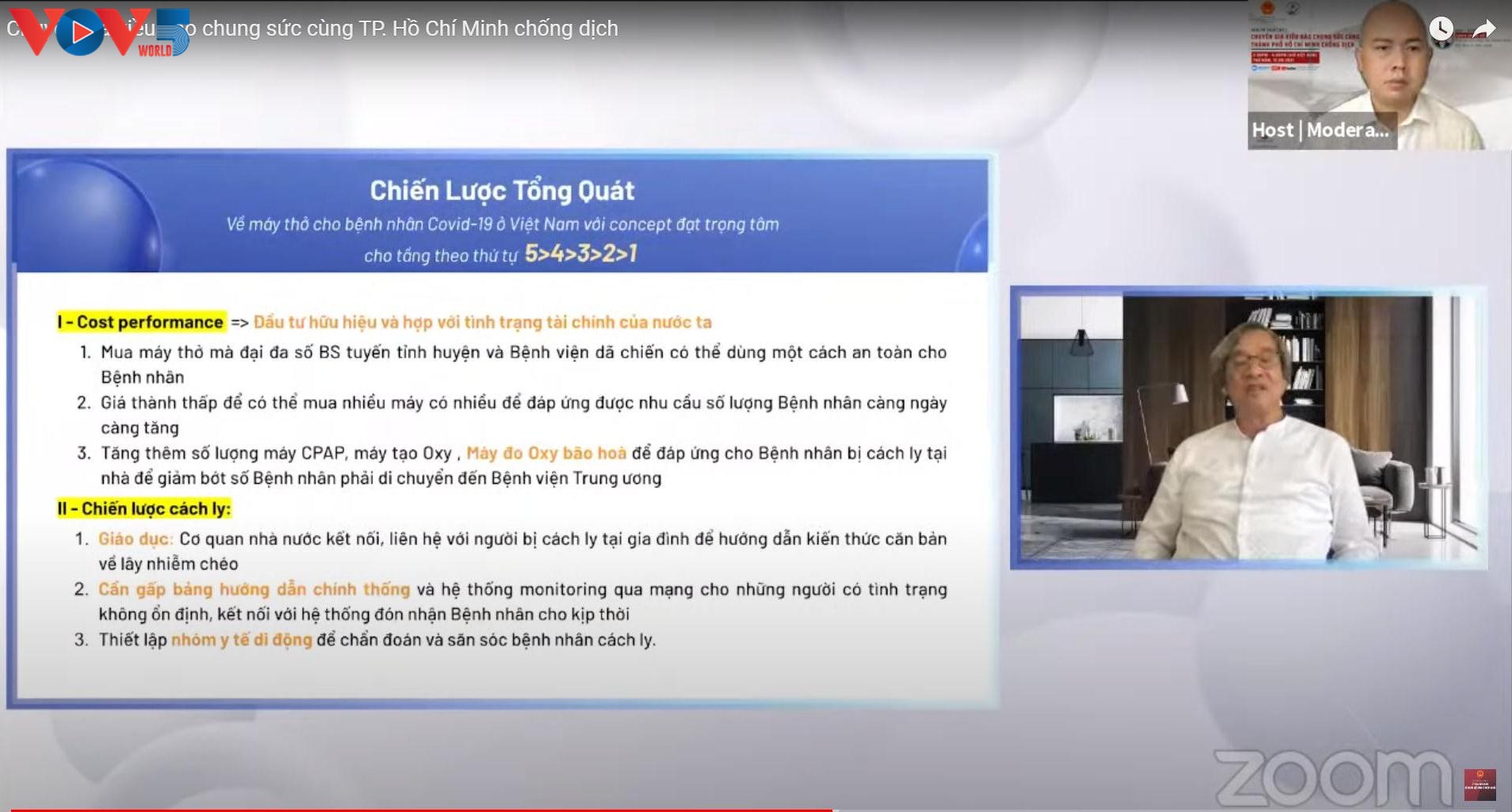 Tại buổi hội thảo, chuyên gia kiều bào, bác sĩ Vũ Ngọc Khuê (ở Mỹ) - cựu bác sĩ Phòng Dịch tễ Viện Pasteur TPHCM, nói về chiến lược và kế hoạch khống chế dịch Covid-19 “4 tuần cho 4 cốt lõi và 4 mục tiêu”. Theo ông, ba chiến tuyến chống dịch gồm: Người dân tại nơi cư trú; lực lượng y tế, bác sĩ, y tá trong bệnh viện, cơ sở y tế hay khu cách ly điều trị bệnh nhân; các lực lượng vũ trang. Bốn mục tiêu mà bác sĩ Vũ Ngọc Khuê đặt ra là: Điều trị bệnh nhân tích cực, giảm thiểu tử vong càng thấp càng tốt; ngăn chặn và chấm dứt lây lan, kéo đường biểu đồ dịch bệnh xuống dần và đi tới bằng 0; khử trùng, thanh lọc môi trường để người dân sống an toàn và đề phòng tái phát; mở lại các hoạt động kinh doanh khi hội đủ các yêu cầu hết dịch. “Cần có kế hoạch toàn diện, được chuẩn bị đầy đủ, chi tiết và cụ thể. Điều kiện tiên quyếtc ho dập dịch covid 19 biến thể Delta thành công là một kế hoạch toàn diện, mọi người đồng tâm, đồng loạt và đồng thời.” – Bác sĩ Khuê khẳng định.