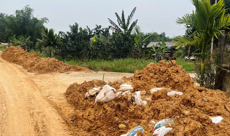 Những bao tải đựng đất làm kè chắn lũ, giờ vẫn ngổn ngang trên những con đường làng |