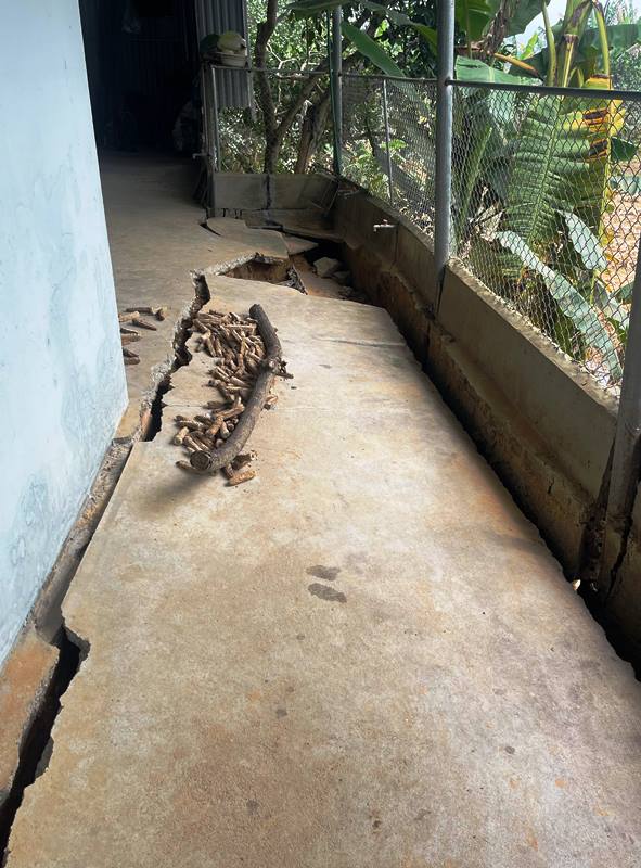 Mưa lũ làm nứt cả khoảng sân, sát đến chân tường |