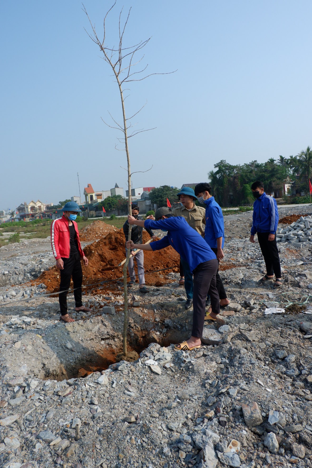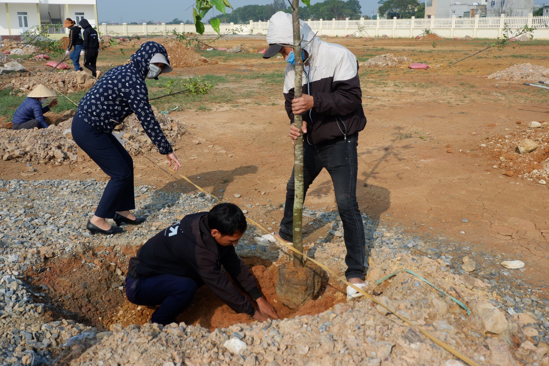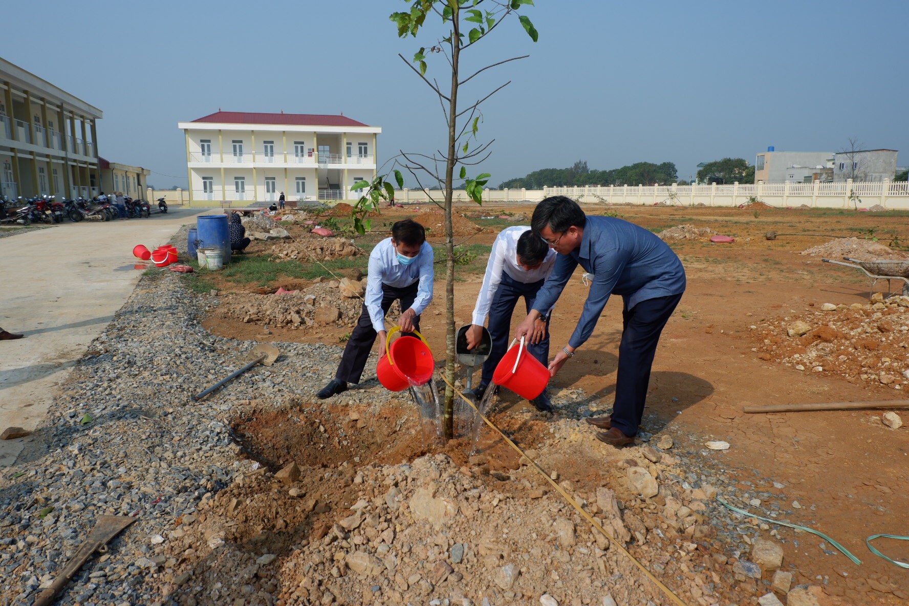 Lãnh đạo xã Hải Lộc và đại diện công ty cổ phần quảng cáo Thanh niên Hà Nội thực hiện việc trồng cây tại trường mầm non Hải Lộc. |