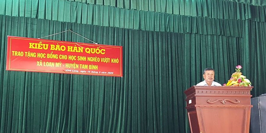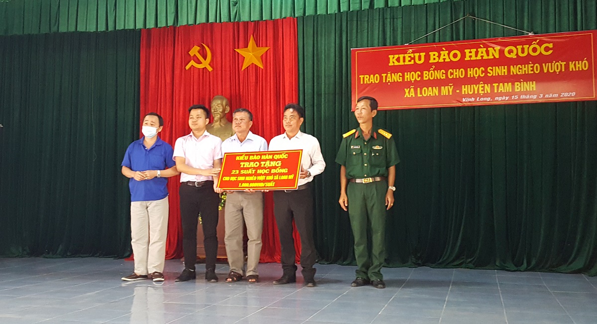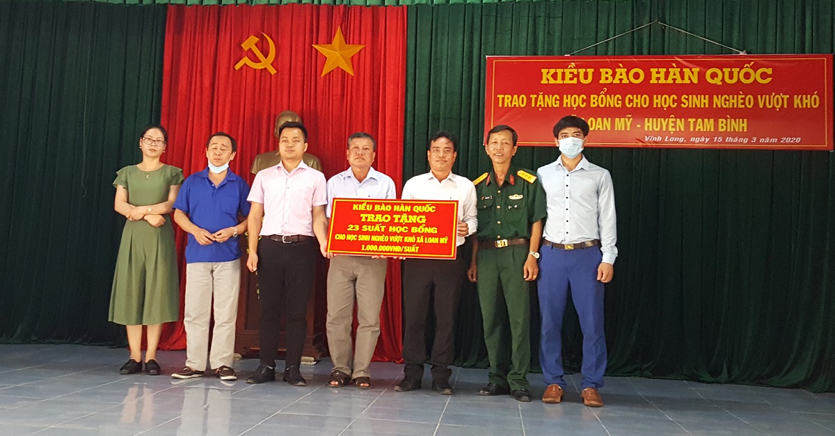 Ngày 15/03/2020, cộng đồng kiều bào Việt Nam tại Hàn Quốc đang cách ly tại tỉnh Vĩnh Long đã trao 23 suất học bổng cho học sinh nghèo vượt khó tại địa bàn xã Loan Mỹ, huyện Tam Bình, tỉnh Vĩnh Long nhằm giúp đỡ các em vững bước trên con đường tới trường.