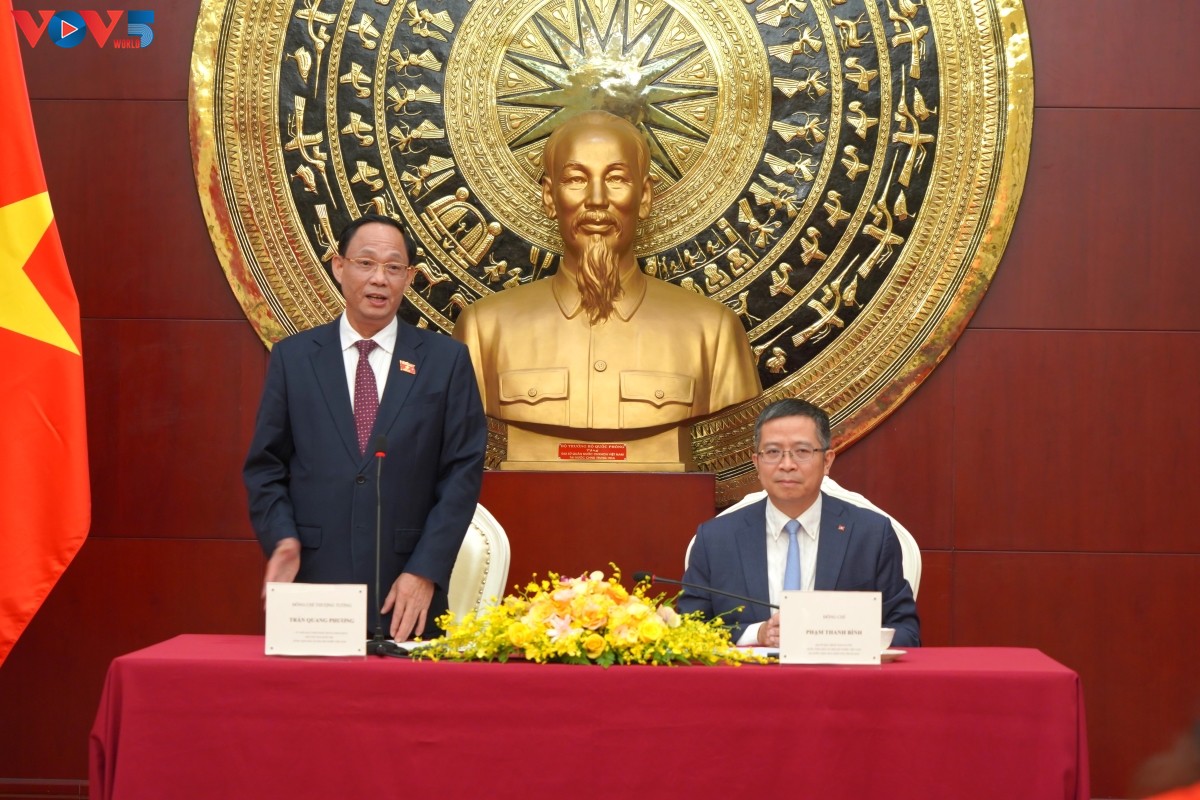 Tại buổi gặp mặt, Phó Chủ tịch Quốc hội Trần Quang Phương ghi nhận những đóng góp của Đại sứ quán Việt Nam tại Trung Quốc trong lộ trình xây dựng “bộ tứ trụ cột” các Nghị quyết quan trọng của Bộ Chính trị trong kỷ nguyên vươn mình; bày tỏ tin tưởng rằng Đại sứ quán tiếp tục có những đóng góp xứng đáng vào việc củng cố và phát triển quan hệ Việt Nam - Trung Quốc. Phó Chủ tịch Quốc hội đánh giá cao vai trò “đại sứ nhân dân” của kiều bào và lưu học sinh tại Trung Quốc.