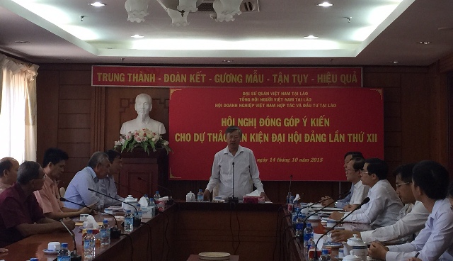 Sáng nay (14/10), tại trụ sở Đại sứ quán Việt Nam ở thủ đô Viêng chăn (Vientiane)- Lào đã diễn ra Hội nghị đóng góp cho dự thảo văn kiện Đại hội Đảng lần thứ 12. Tới dự có đại diện bà con kiều bào đang sinh sống tại thủ đô Viêng chăn, các doanh nghiệp Việt Nam tại Lào, cán bộ nhân viên Đại sứ quán. Chương trình do Đại sứ quán Việt nam tại Lào, Tổng hội người Việt Nam tại Lào, Hội doanh nghiệp Việt Nam hợp tác và đầu tư tại Lào phối hợp tổ chức. Tổng hợp của PV Đài TNVN thường trú tại Lào.