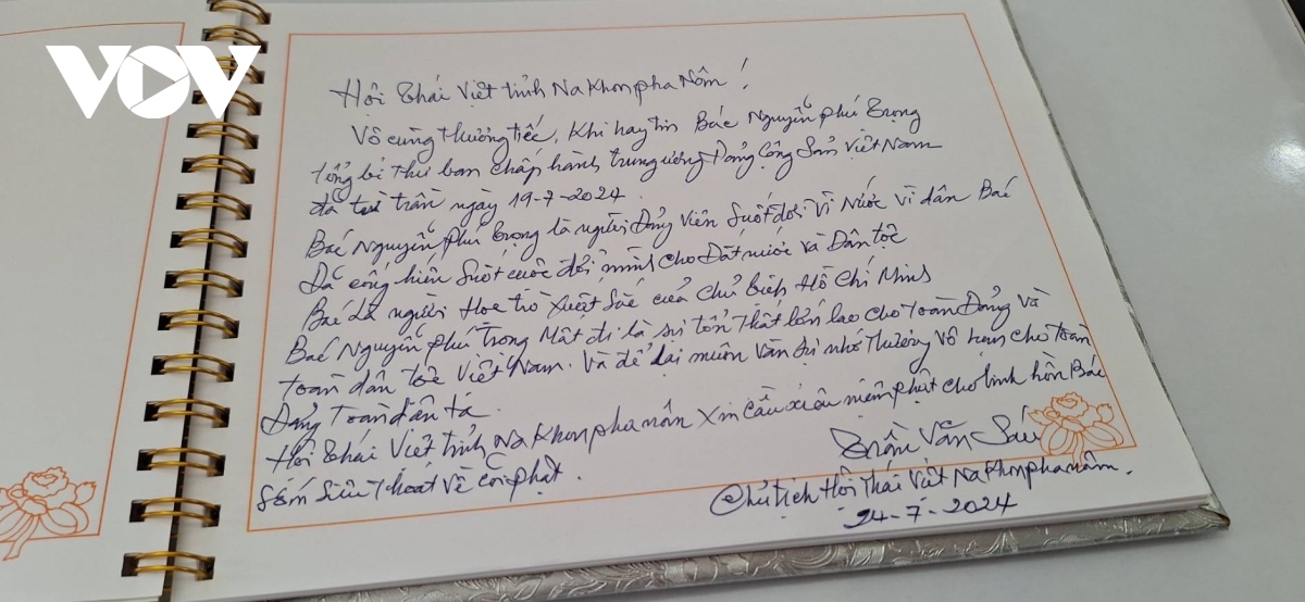 Ghi trong sổ tang, ông Trần Văn Sáu, Phó Chủ tịch Hội người Việt Nam toàn Thái Lan, Chủ tịch Hội người Việt tỉnh Nakhon Phanom, khẳng định Tổng Bí thư Nguyễn Phú Trọng là một người Đảng viên suốt đời vì nước vì dân. Ông Sáu xúc động cho biết sự ra đi của Tổng Bí thư Nguyễn Phú Trọng là mất mát lớn của toàn Đảng, toàn dân tộc Việt Nam, để lại muôn vàn thương nhớ cho nhân dân.