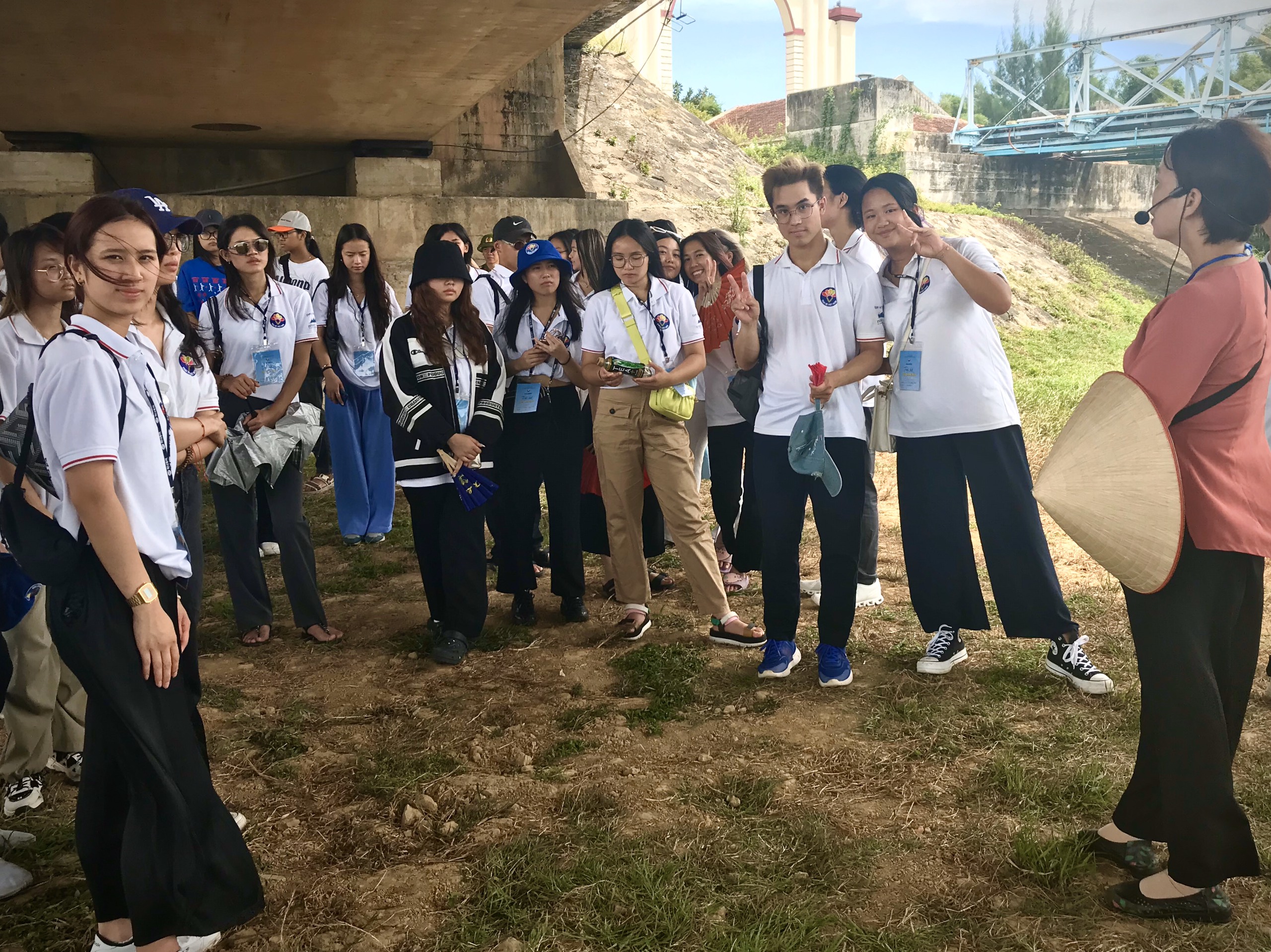 Các bạn trẻ kiều bào nghe kể chuyện về cây cầu Hiền Lương, di tích lịch sử Quốc gia đặc biệt tại Quảng Trị. |