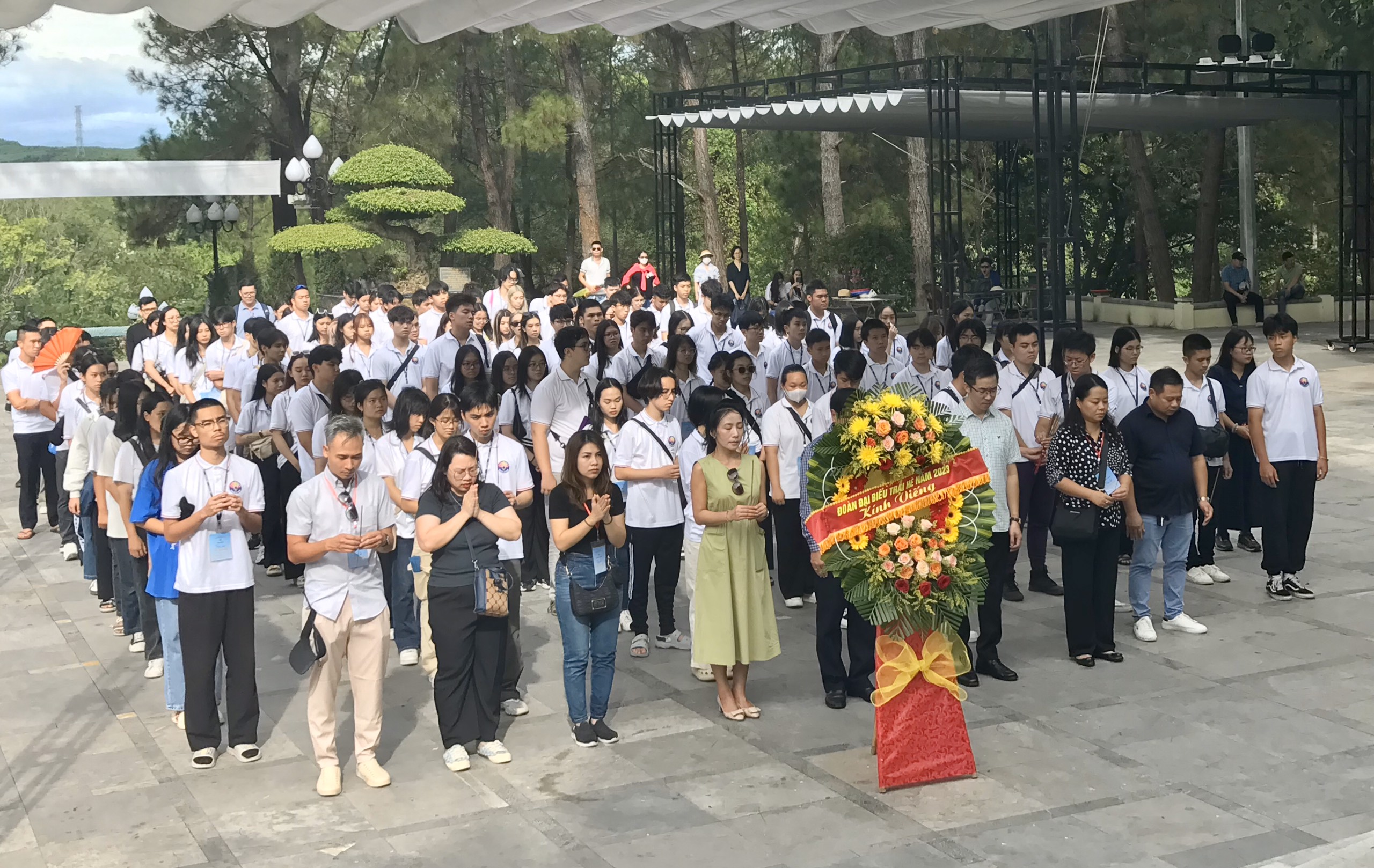 Đoàn Trại hè Việt Nam 2023 thắp hương trước đài tưởng niệm của Nghĩa trang liệt sĩ Quốc gia Trường Sơn. |