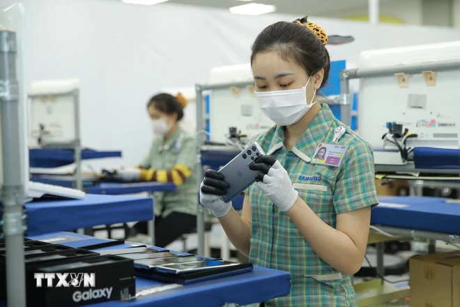 Lắp ráp điện thoại thông minh tại Công ty Samsung Electronic Việt Nam Thái Nguyên-Khu Công nghiêp Yên Bình, Thái Nguyên. Ảnh: Hoàng Nguyên/TTXVN |