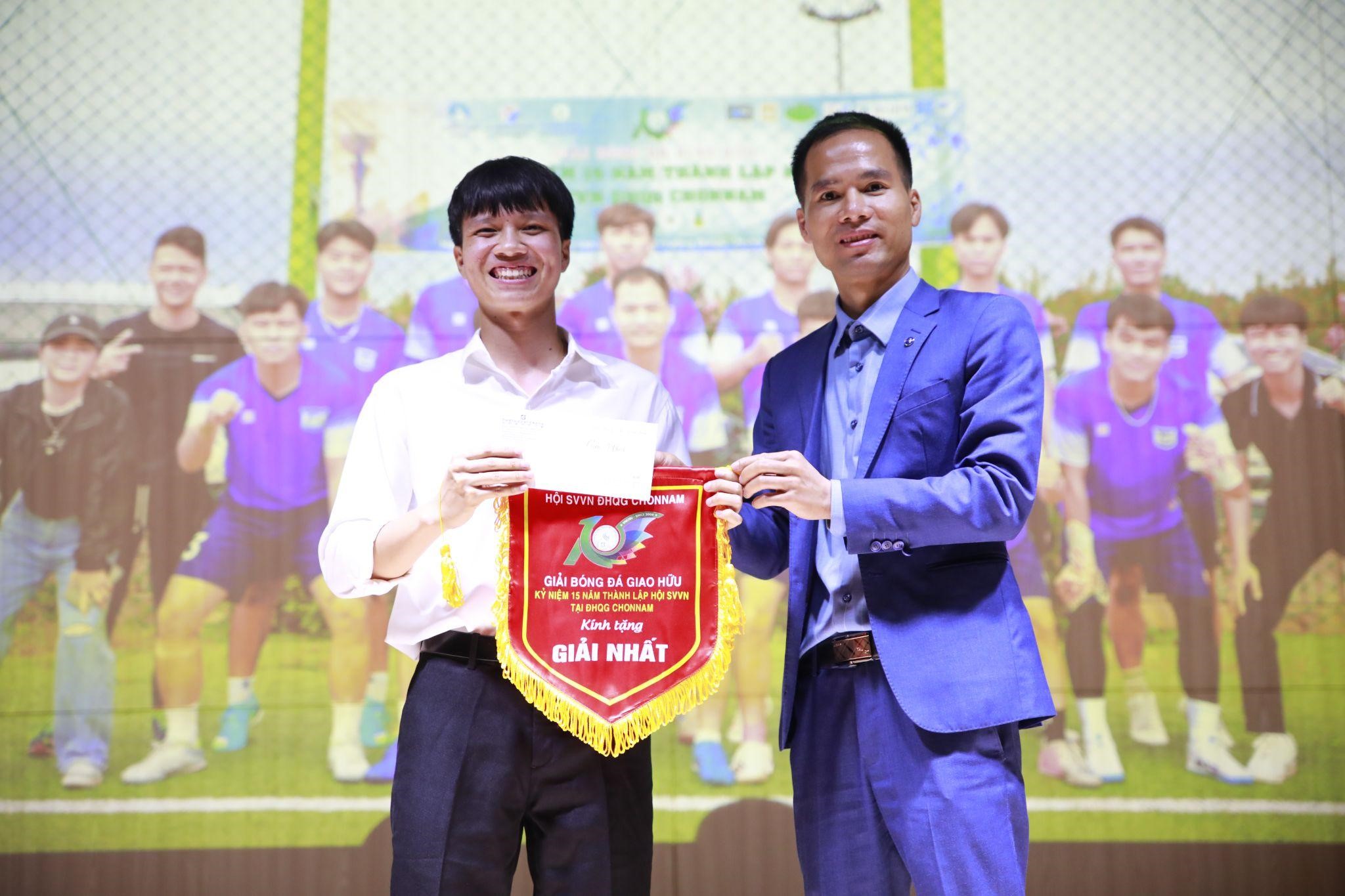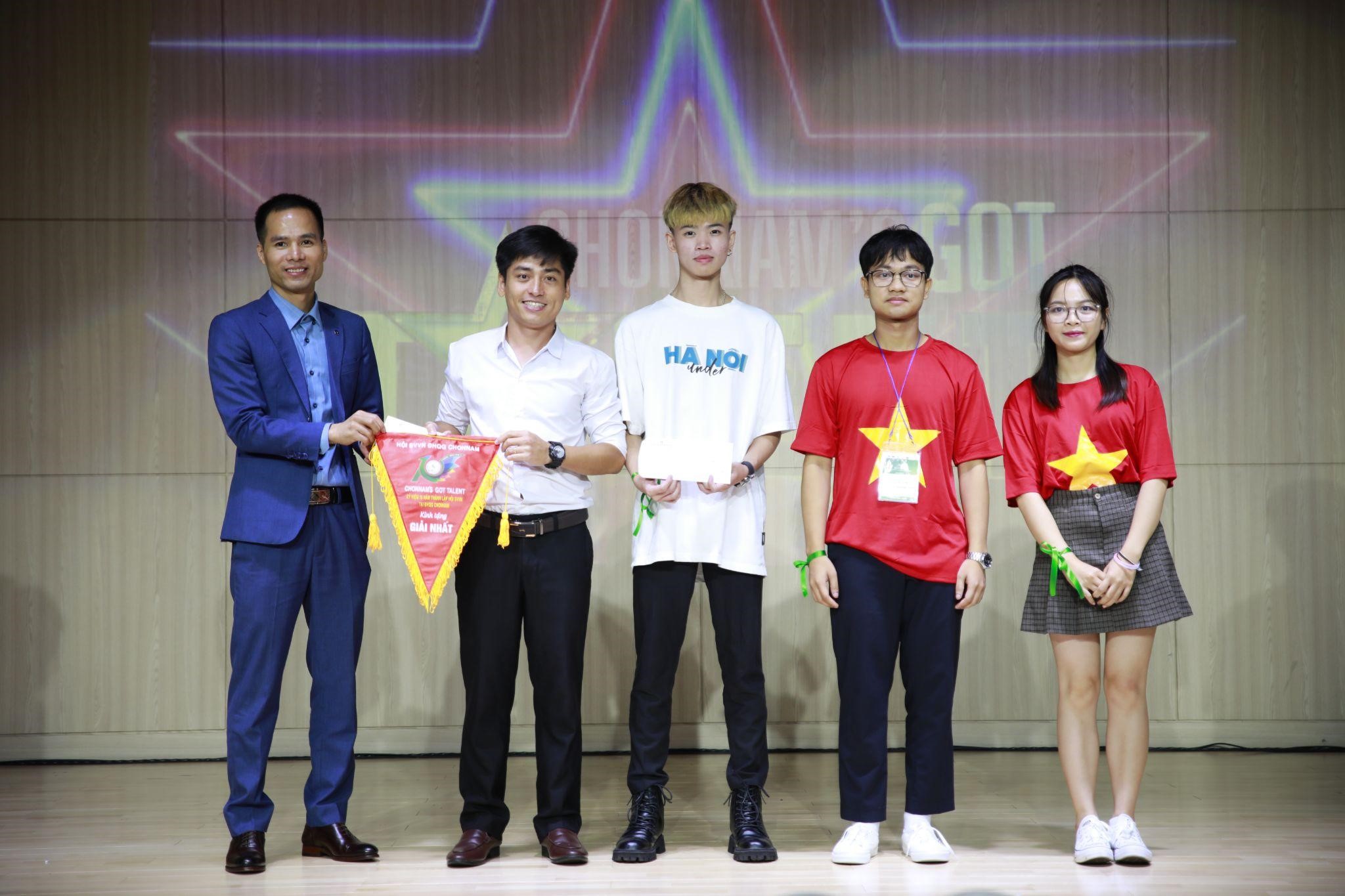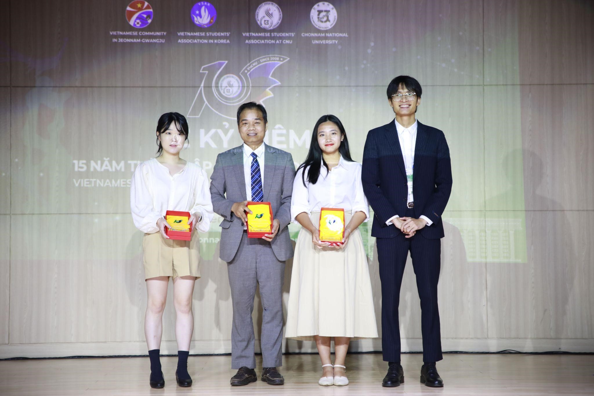 Đại diện nhà tài trợ Công ty Cổ phần Thương mại Xuất nhập khẩu KN trao giải Nhất cuộc thi “Chonnam’s Got Talents”. |