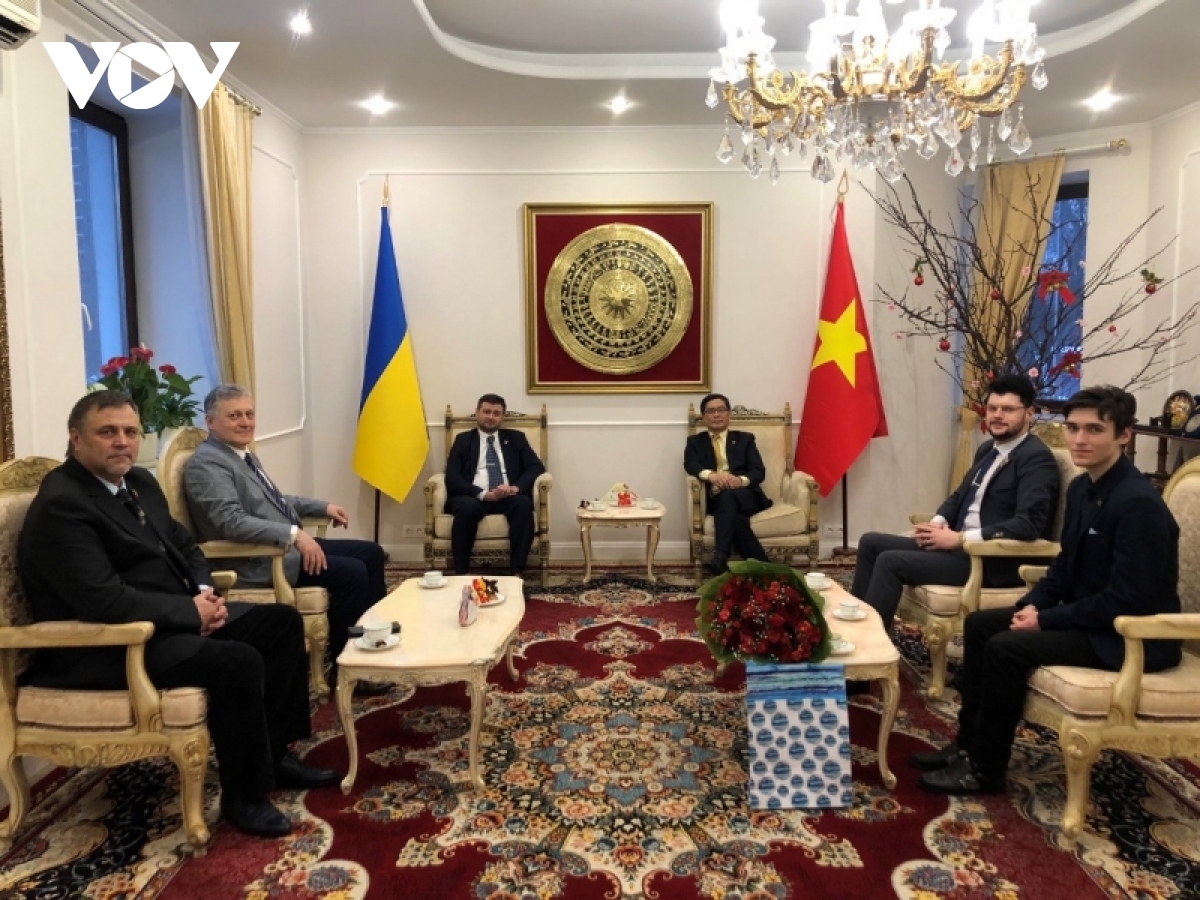 Ngày 24/1, tại trụ sở của Đại sứ quán Việt Nam tại Ucraina, Đại sứ Việt Nam Nguyễn Hồng Thạch tiếp Chủ tịch Hội Họa sĩ Ucraina Konstantin Cherniavskyy, Giám đốc Nhà máy Hàng không Kharkov Oleksandr Kryvokon, Phó Chủ tịch điều hành Quỹ Văn hoá Gorchakov Andrey Gorchakov và Trưởng khoa Đại học Y Odessa Ruslan Vastyanov… và một số đối tác, bạn bè Ucraina đến chúc mừng Đại sứ quán nhân dịp kỷ niệm 30 năm thiết lập quan hệ ngoại giao Việt Nam -Ucraina.