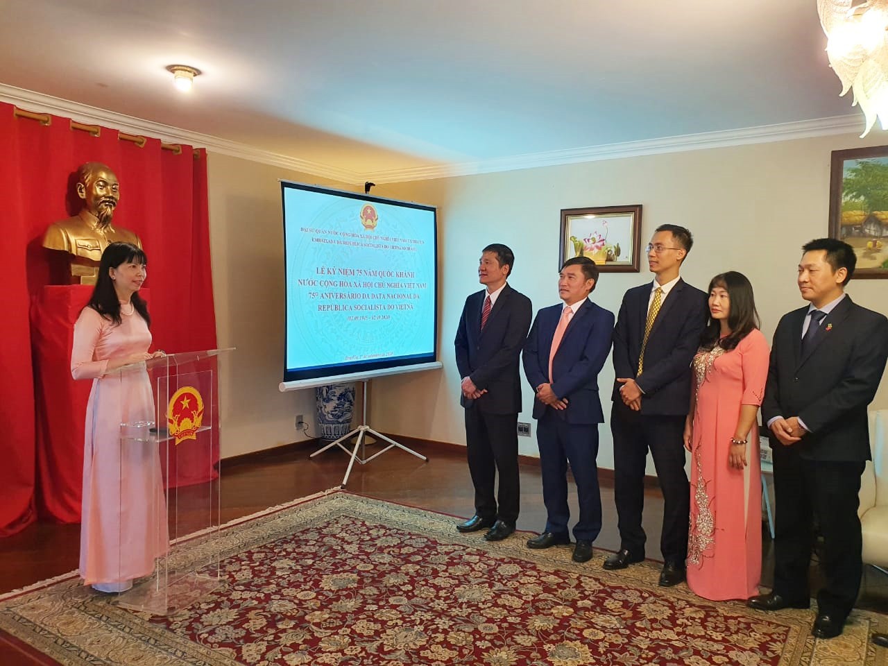 Phát biểu tại buổi lễ, đại sứ Phạm Thị Kim Hoa nhấn mạnh: Đất nước Việt Nam đã có những bước chuyển mình trong lịch sử phát triển 75 năm qua, trở thành một nước Việt Nam mới, với diện mạo mới và vị thế mới trên trường quốc tế. Mặc dù bị ảnh hưởng lớn bởi đại dịch nhưng kinh tế Việt Nam vẫn ổn định, GDP 6 tháng 2020 vẫn đạt mức tăng trưởng dương, đạt gần 2%. Cán cân thương mại thặng dư gần 11 tỷ USD.