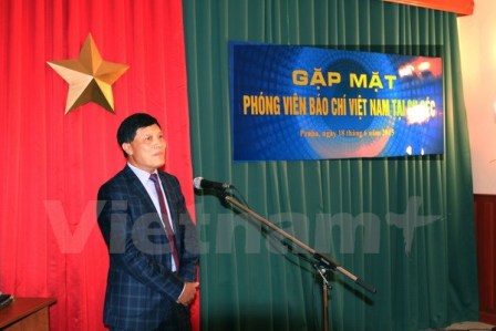| Đại sứ Trương Mạnh Sơn chủ trì cuộc gặp mặt báo chí Việt ở Séc nhân dịp 21/6. (Ảnh: Hồng Tâm/Vietnam+) |