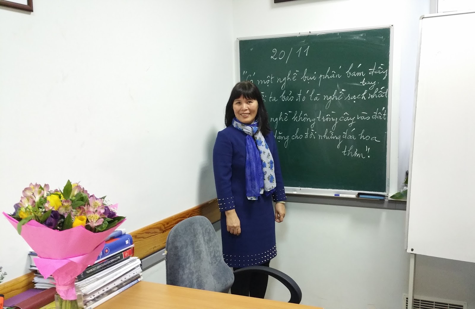 Những bó hoa tươi thắm, những bài hát, những vần thơ được các em trình bày bằng tiếng Việt, trong trang phục Việt Nam cùng với phong cách Việt đã đem đến niềm xúc động cho các thầy cô tổ bộ môn tiếng Việt và người nghe. Chỉ với hơn 2 tháng học tiếng ca khúc Bụi phấn “Khi thầy viết bảng, bụi phấn rơi rơi. Có hạt bụi nào, rơi trên bục giảng, có hạt bụi nào vương trên tóc thầy…” đã được các em sinh viên năm thứ Nhất trình bày rất thành công.