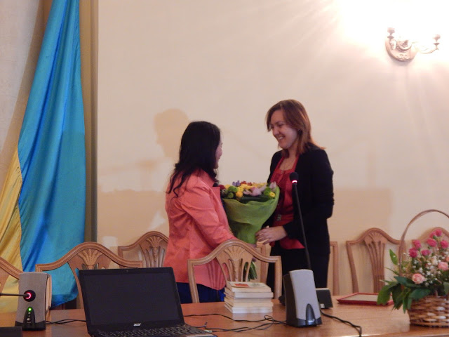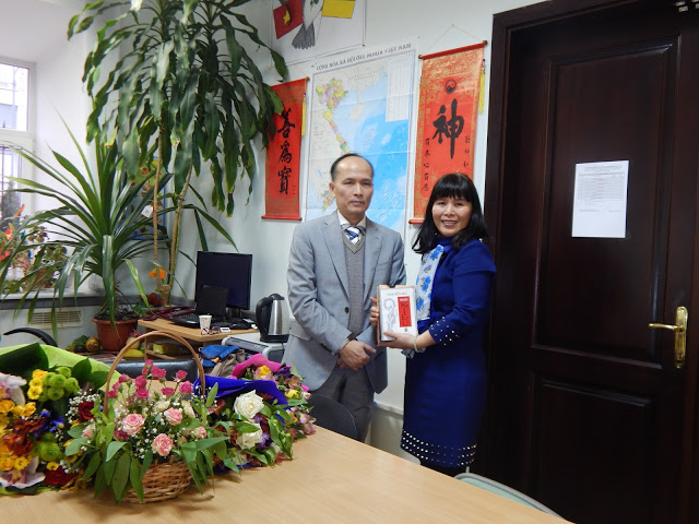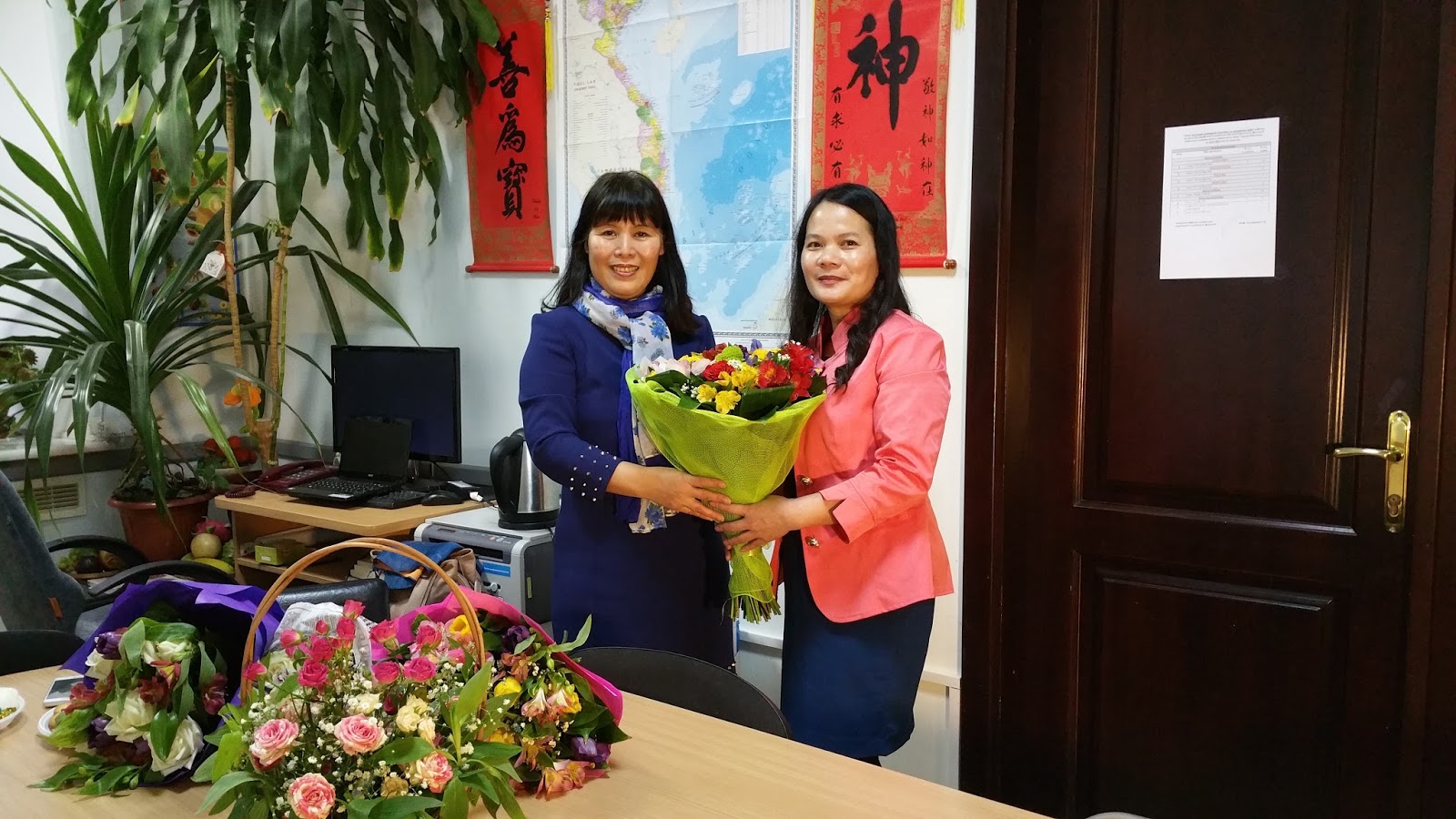 Thay mặt báo người xứ Nghệ Kiev, nhà thơ Đỗ Thị Hoa Lý tặng hoa chia sẻ niềm vui được tham dự ngày vui cùng các thầy cô. Nhân dịp này, một số tác phẩm văn học Việt Nam như Truyện Kiều, Nhật ký Đặng Thùy Trâm (bản dịch tiếng Nga của nhà thơ Nguyễn Huy Hoàng), Ca dao – Tục ngữ Việt Nam… đã được nhà thơ tặng Trung tâm Việt Nam học với hy vọng đóng góp vào thư viện vốn đang rất thiếu thốn và mong mỏi một ngày không xa, các tác phẩm văn học Việt Nam sẽ được dịch ra tiếng Ukraina.