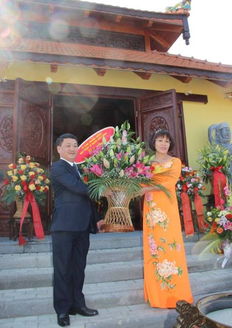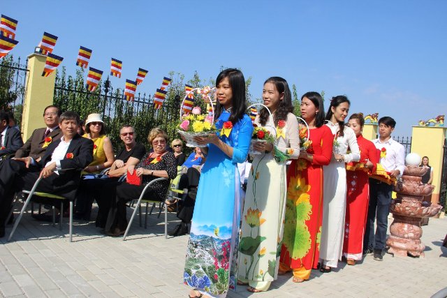 Bà Phan Bích Thiện, Chủ tịch Quỹ vì quan hệ Hungary Việt Nam (áo dài vàng), tại buổi khánh thành chùa Đại Bi.