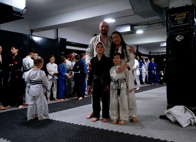 Chị Rose Cao cùng chồng và hai con nhỏ trong lớp tập võ. Ảnh: FBNV