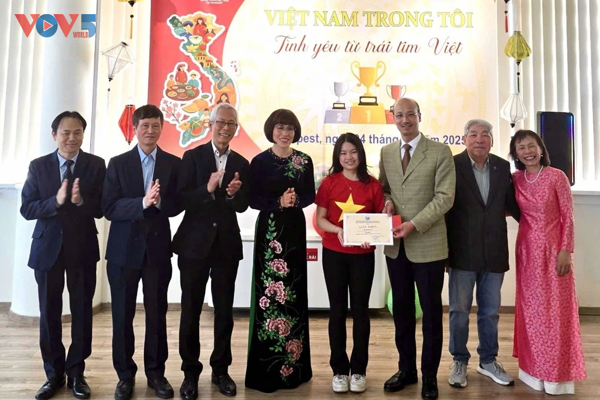 Trong khuôn khổ các hoạt động kỷ niệm 75 năm ngày thiết lập quan hệ ngoại giao giữa Việt Nam và Hungary (1950-2025), Lễ tổng kết cuộc thi sáng tác “Việt Nam trong tôi” diễn ra ngày 04/05 tại Trung tâm thương mại World Mall, thủ đô Budapest. Đại diện các hội đoàn người Việt tại Hungary cùng đông đảo thầy cô giáo, phụ huynh, học sinh người Việt tham dự.