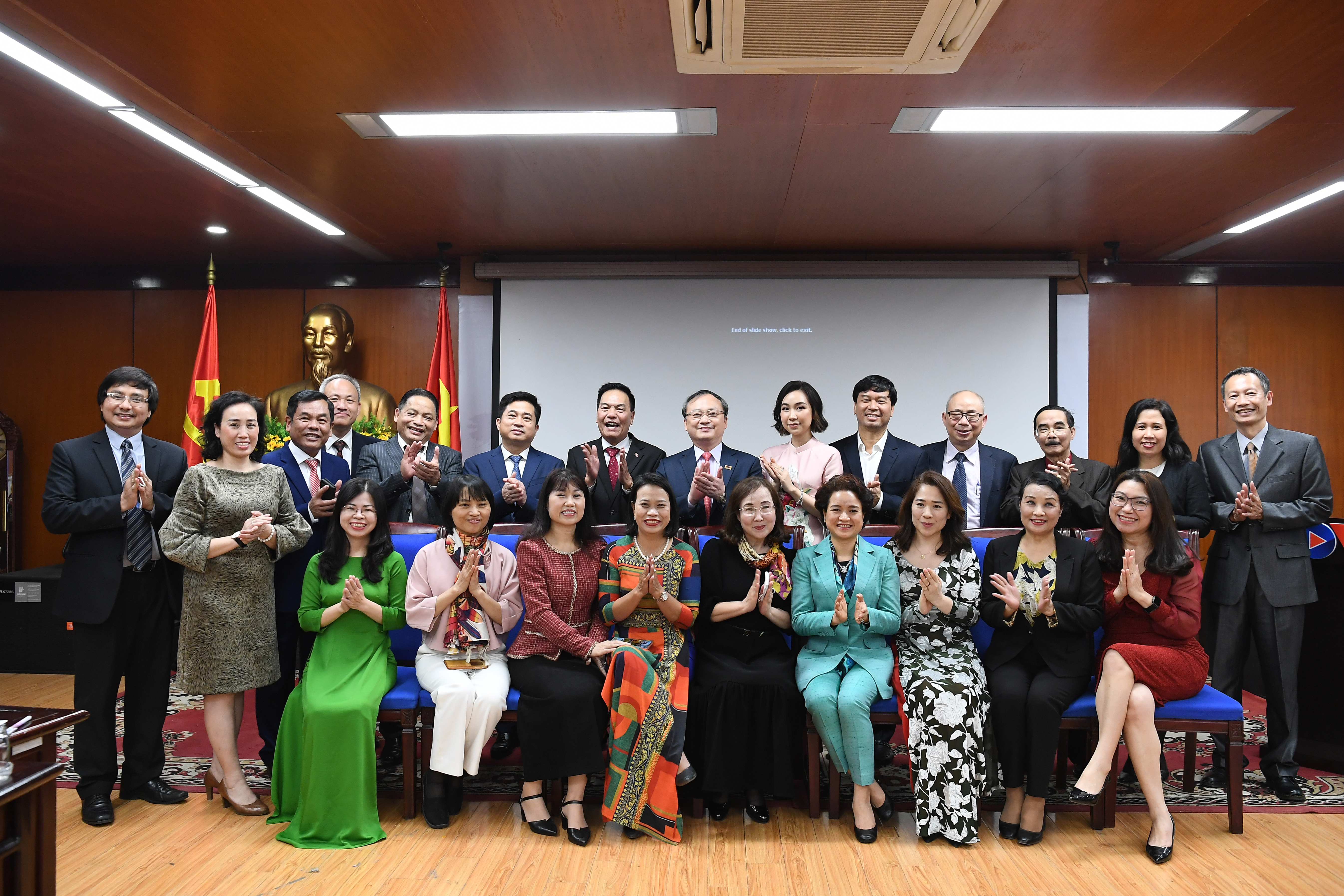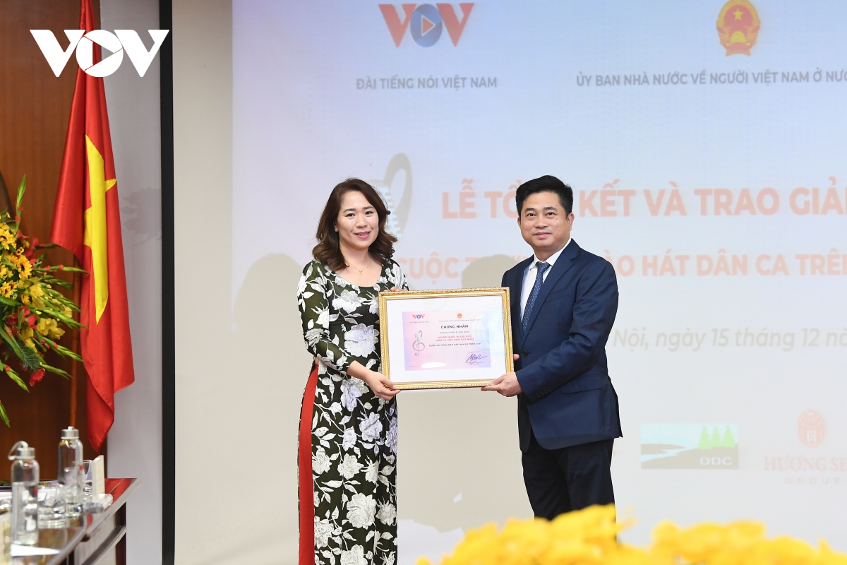 Ông Đinh Hoàng Linh, Vụ trưởng Vụ thông tin văn hóa, Ủy ban Nhà nước về người Việt Nam ở nước ngoài trao Giải Người nước ngoài hát dân ca Việt Nam hay nhất cho thí sinh Kim Yoon Ji. |