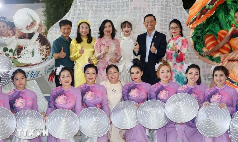 Thứ trưởng Bộ Ngoại giao, Chủ nhiệm Ủy ban Nhà nước về người Việt Nam Lê Thị Thu Hằng cùng Đại sứ Trần Phước Anh chụp ảnh lưu niệm cùng các nghệ sĩ thuộc cộng đồng người Việt. Ảnh: Ngọc Khương/TTXVN |