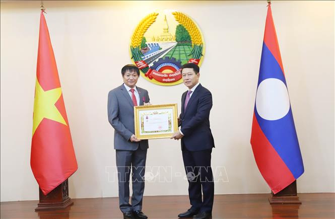Phó Thủ tướng Lào Saleumxay Kommasith (phải) trao tặng Huân chương Tự do hạng Ba cho Đại sứ Việt Nam tại Lào Nguyễn Bá Hùng. Ảnh: Xuân Tú/TTXVN |